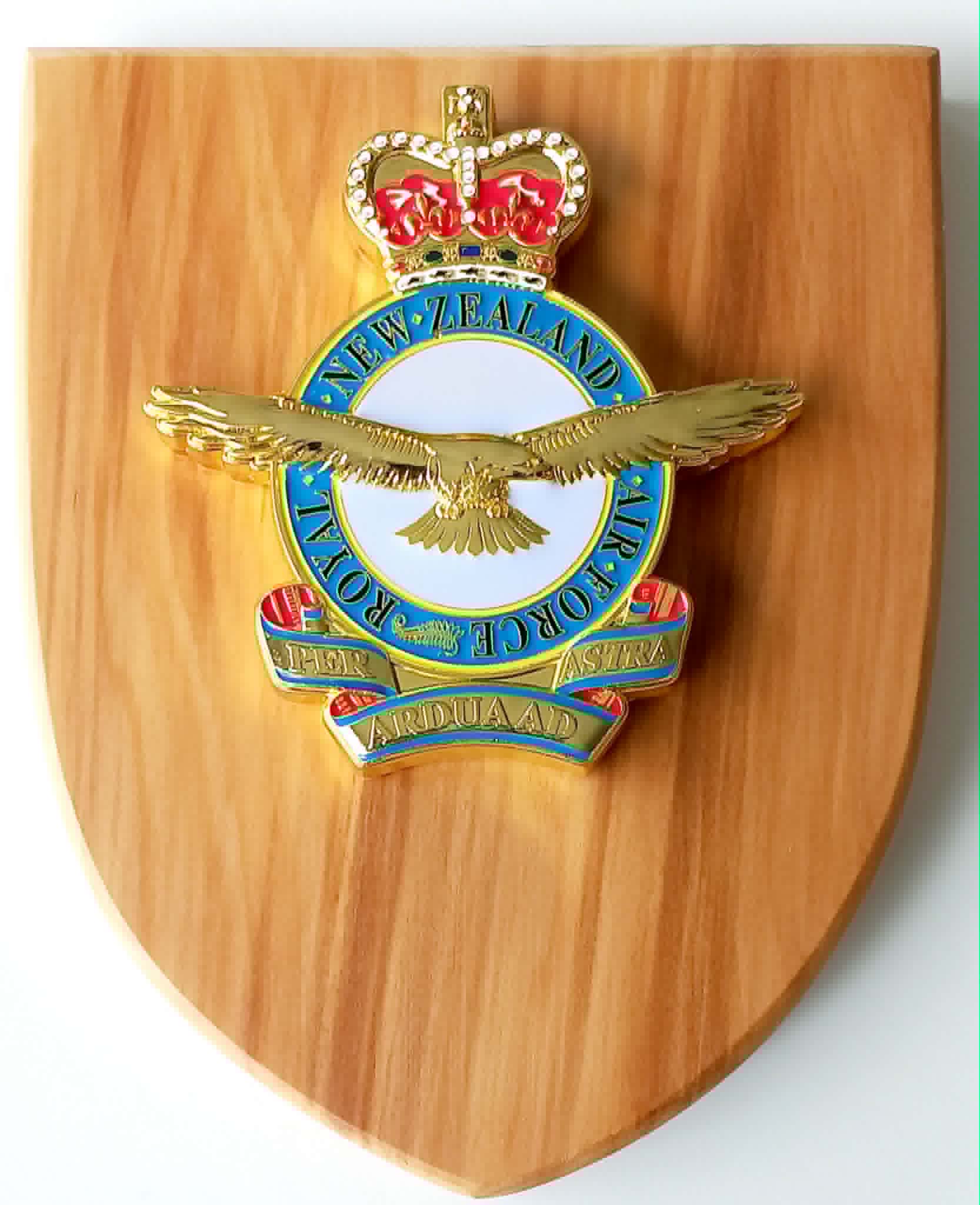 Cast enamel RNZAF crest on Rimu shield. (Engraved plaques added on request for an additional $10+ GST)
