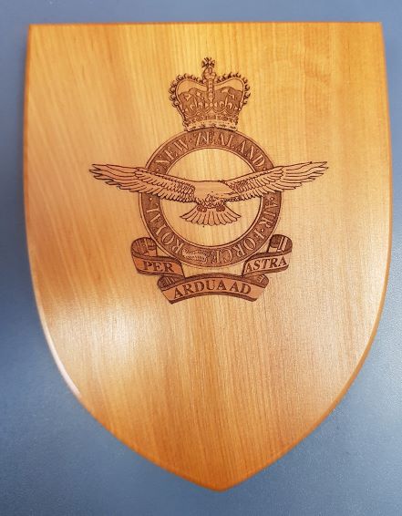 Highly detailed RNZAF rimu crest on rimu shield. (Engraved plaques added on request for an additional $10+ GST)